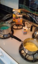 I mixed mine up in two pans, so I could have two colors. I recommend choosing two primary colors (red, yellow, or blue), so you can mix them into an additional secondary color (orange, green, or purple).