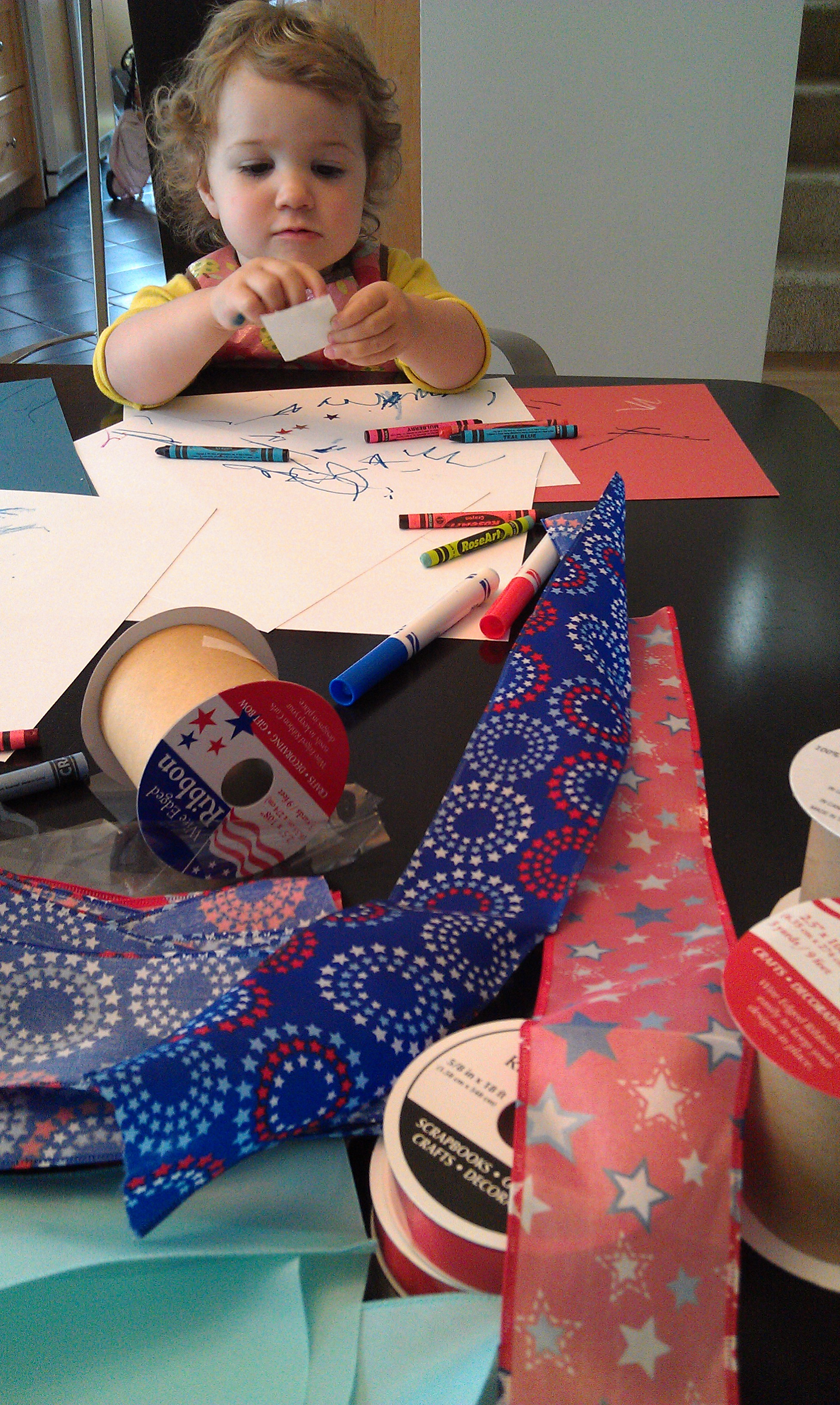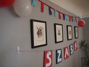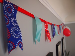 My daughter was intrigued by my work on the flag banner and wanted to help. I gave her several pieces of construction paper in the color theme of the party and let her go to town with stickers, crayons, and markers (all of the same color theme, of course). She loved “helping” and having something fun to do to boot.