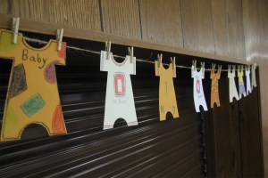 This idea also works well for a shower game. For my sister’s baby shower, I cut out paper onesies and had the guests decorate them. The winner, as chosen by the momma-to-be, received a gift. Plus, the game had the extra benefit of providing decorations for our party … that we didn’t even have to make! My sister then used them as a personalized art piece in the nursery. Love love love.