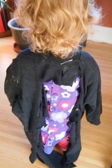 1. Cut straight up the back (not while it’s on your child, silly). Leave the collar intact, or if you want it smaller, cut and safety pin the collar to the correct width.