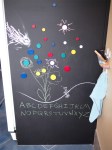 Our toddler particularly likes her new creative play area on the other side of our fridge. We hung a small shower caddy with some 3M hooks to serve as chalk storage and a handy place to keep a towel for wiping it all down.